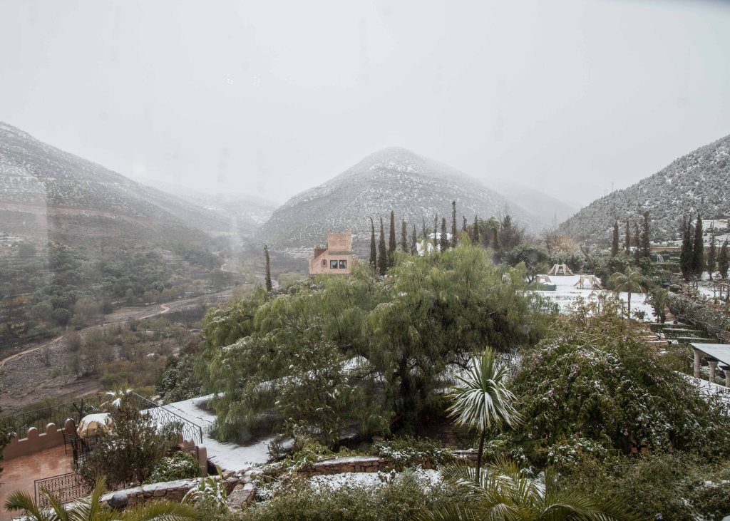 Our next step was about an 1.5 hours drive away up into the Atlas Mountains. We knew the weather would be cold and it had been snowing so we wrapped up warm which felt odd when we were still in the near-desert outskirts of Marrakech. Our destination hotel was called Kasbah Tamadot and we had arranged a transfer through them which made things easier. The drive was very scenic, through small villages and towns and then up into the Atlas foothills. It was only after the town of Asni that the road got a little narrower and steeper with snow on either side.